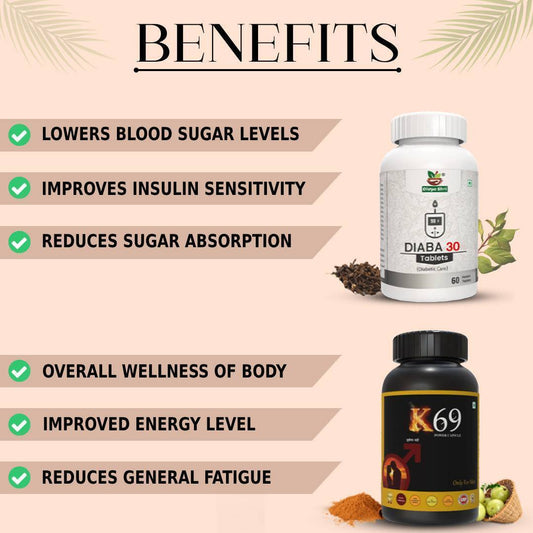 Diaba 30 और K69 Combo – शुगर कंट्रोल और पुरुष शक्ति बढ़ाने की आयुर्वेदिक दवा + FREE Acupressure Clip